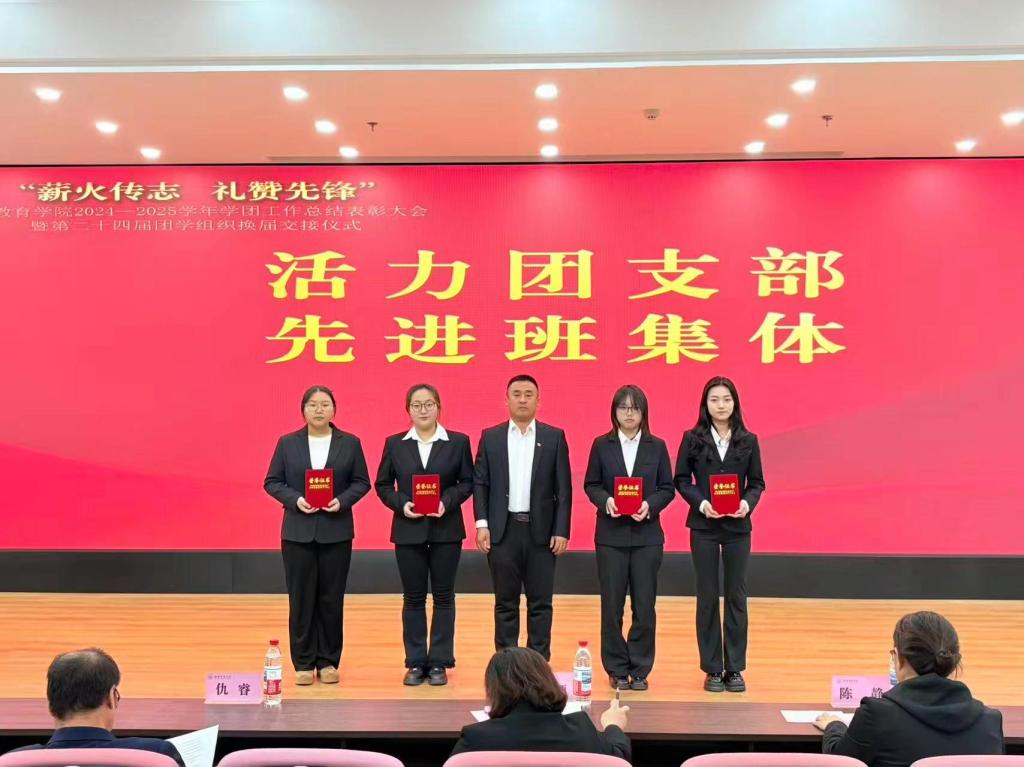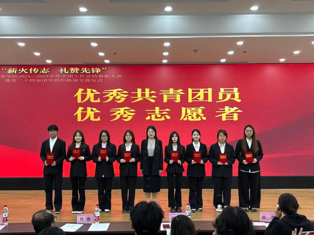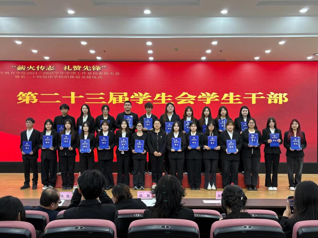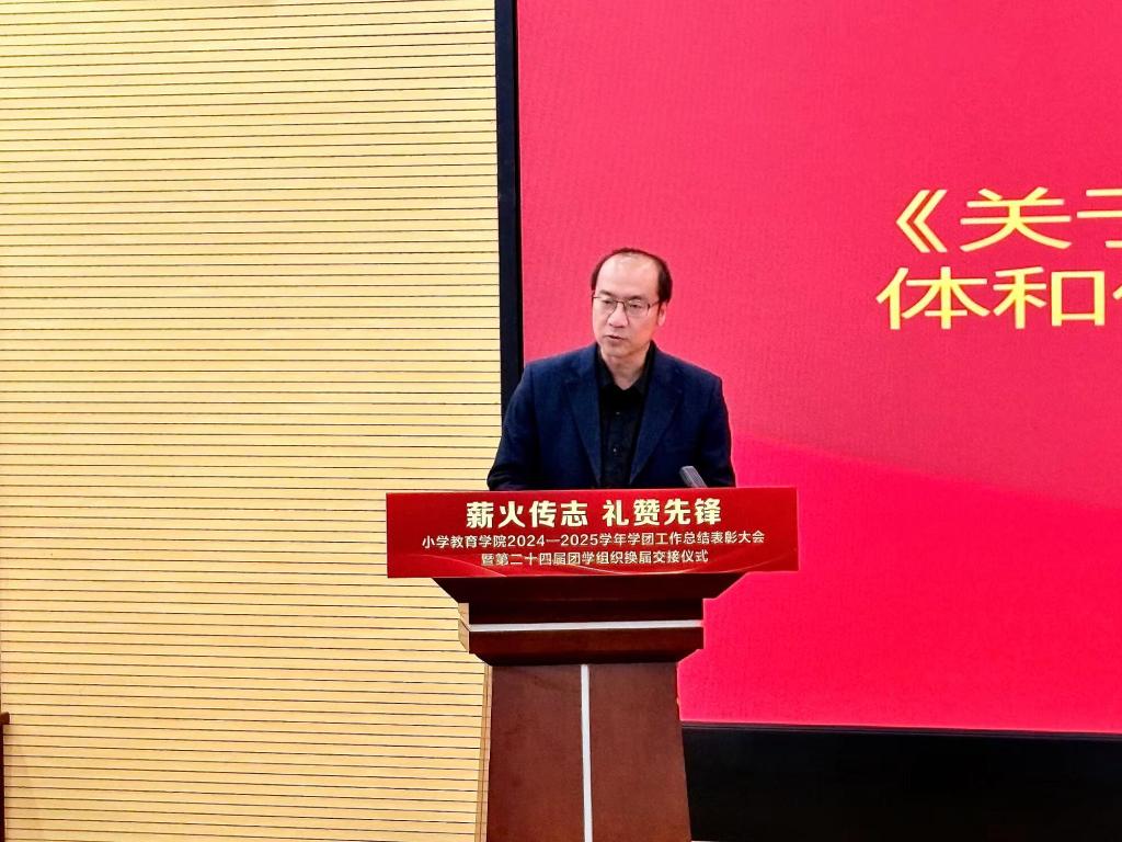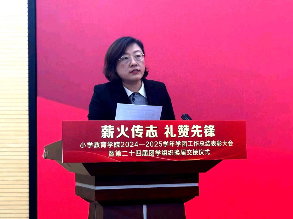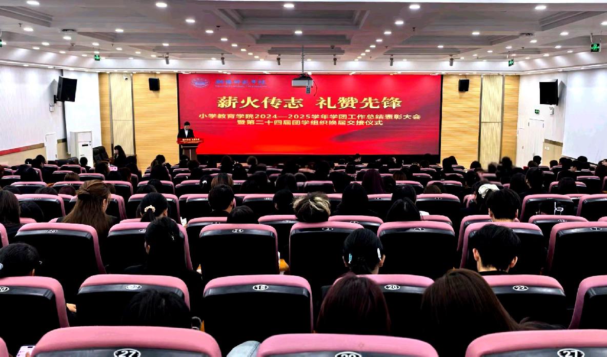 11月5日,小学教育学院“薪火传志 礼赞先锋”2024-2025学年学团工作总结表彰大会暨第二十四届团学组织换届交接仪式在大学生活动中心顺利举行。学院党总支书记赵颖教授、副院长仇睿教授、副院长陈静副教授、党总支副书记王立凯及全体辅导员出席大会,与第23届、第24届团学组织干部、获奖代表及学生代表共同见证了这一承前启后的重要时刻。