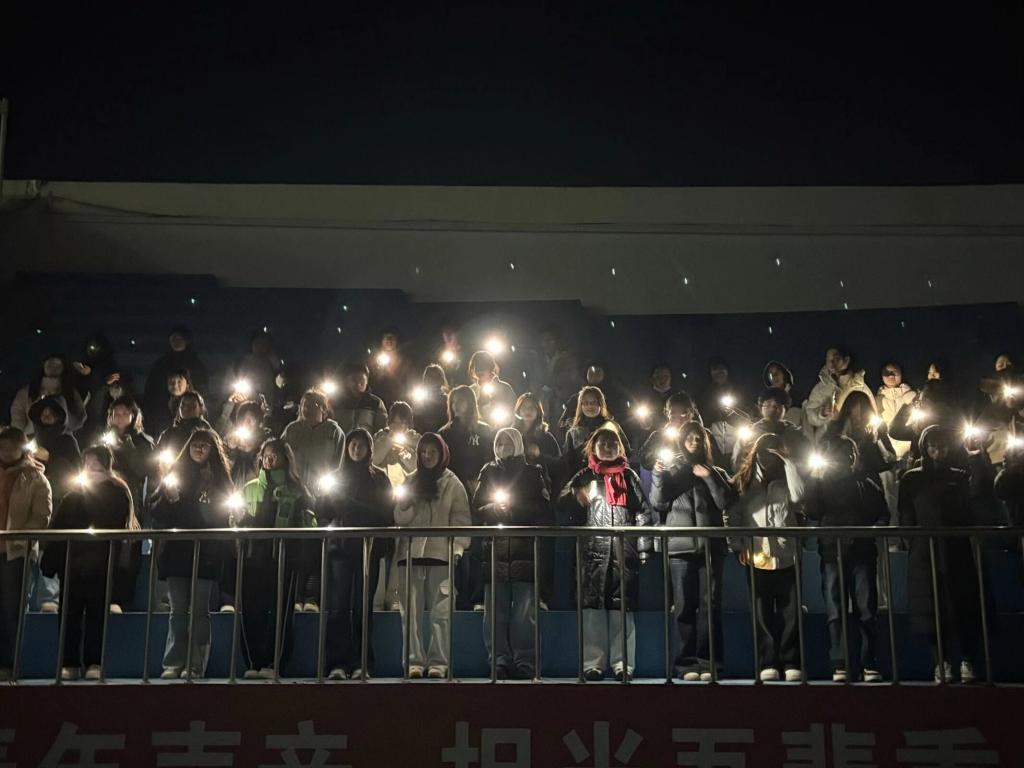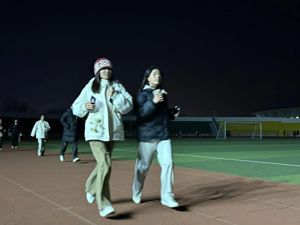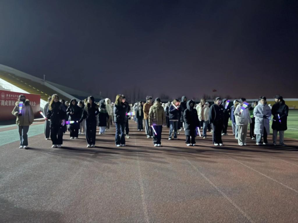 活动当晚组织有序、节奏紧凑。17:30起,各班代表陆续抵达场地集结;18:00正式开始签到并发放荧光装备,点点荧光迅速汇聚成流动的光河,现场气氛热烈升温;18:15,全体参与学生在工作人员带领下进行系统性热身运动,有效激活身体机能,预防运动损伤;18:30,夜跑正式启动,各班级方阵在跑道上并肩前行、互相鼓励,展现出良好的团队风貌与协作精神。